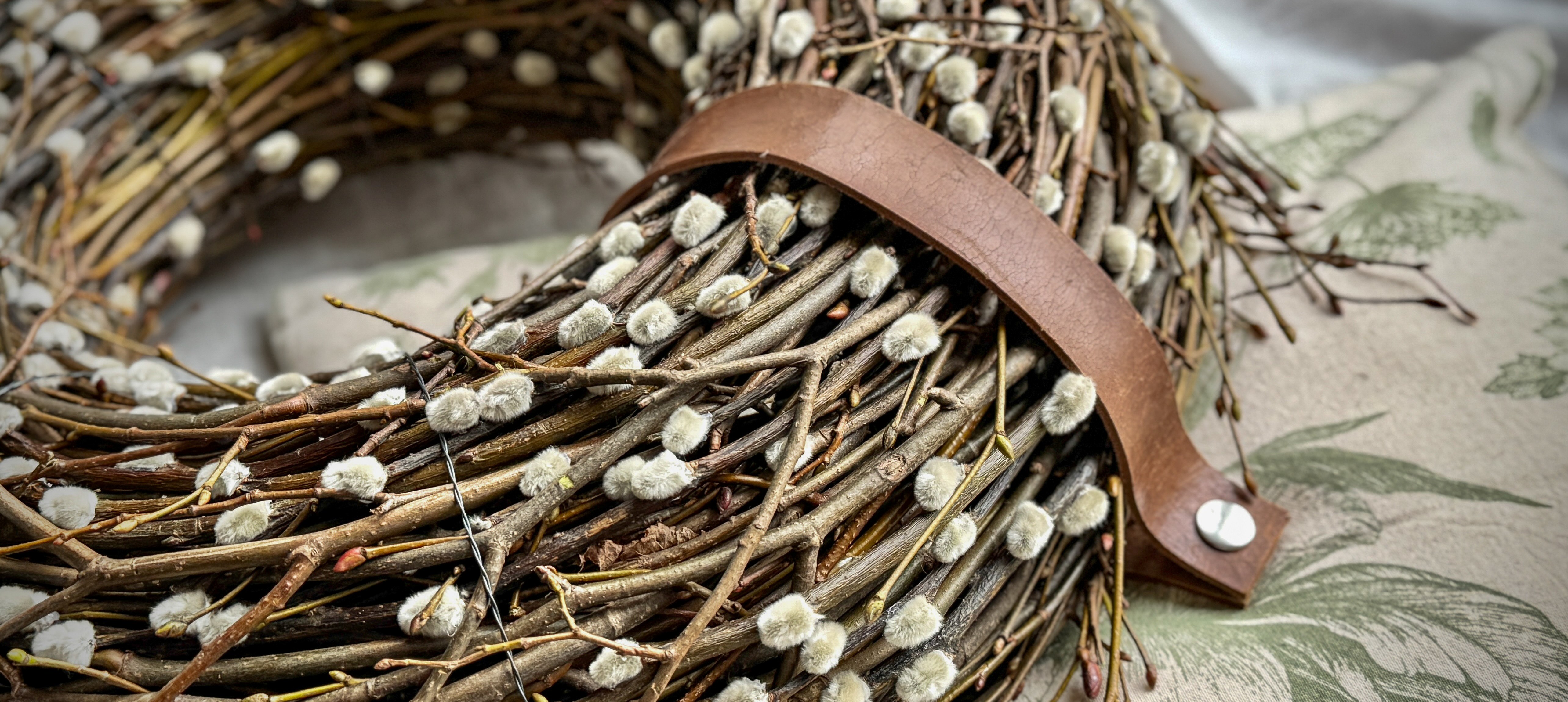 Přírodní věnec z větví, pečlivě ručně vázaný na slaměný korpus. Jeho jednoduchý vzhled podtrhuje kožený pásek – žádné zbytečné ozdoby, jen čistý minimalismus a přirozená krása...