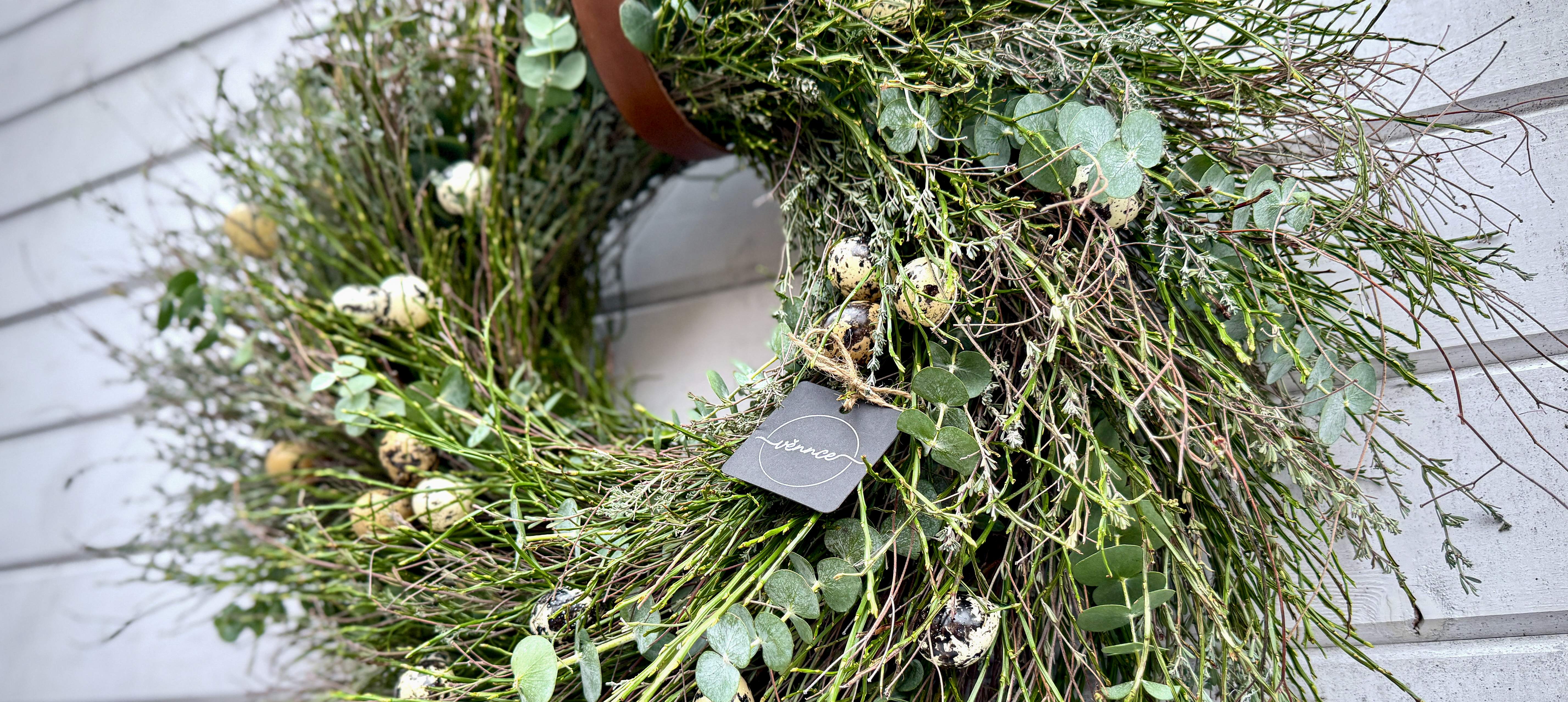 Jarní věnec uvázaný z borůvčí, divokého tymiánu a eukalyptu. Věnec v přirozeném, lehce rozcuchaném stylu je doplněn umělými křepelčími vajíčky, která jsou k nerozeznání od...