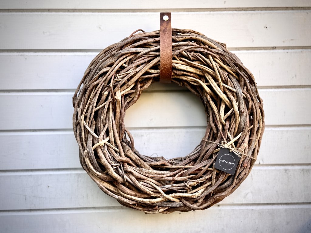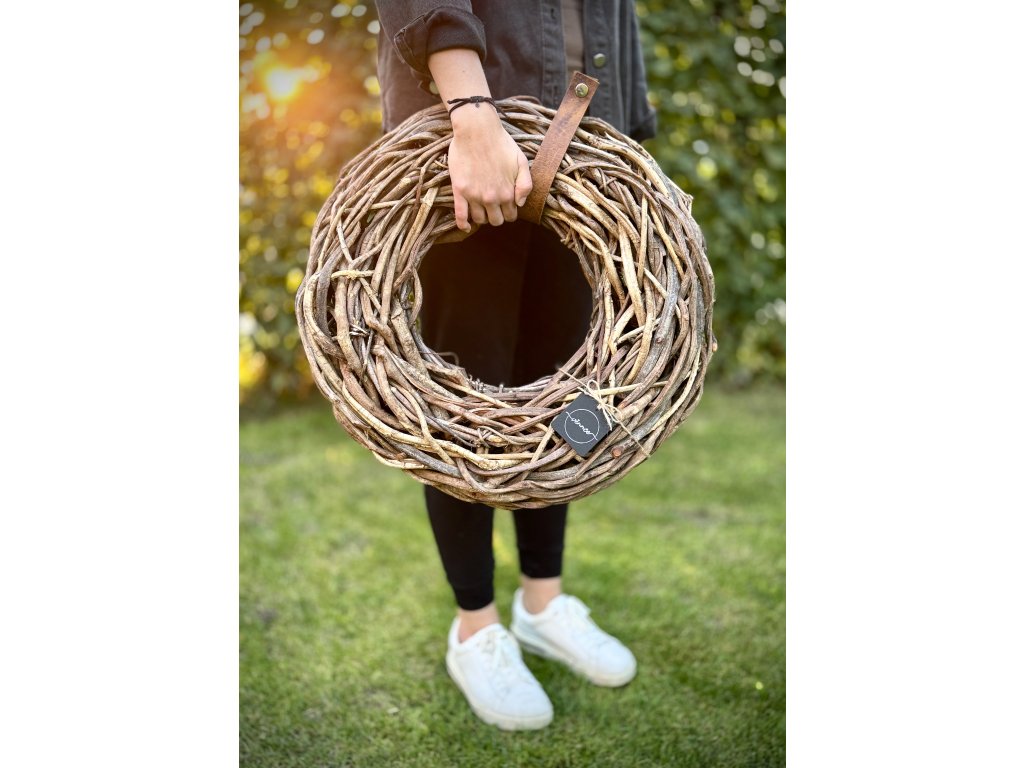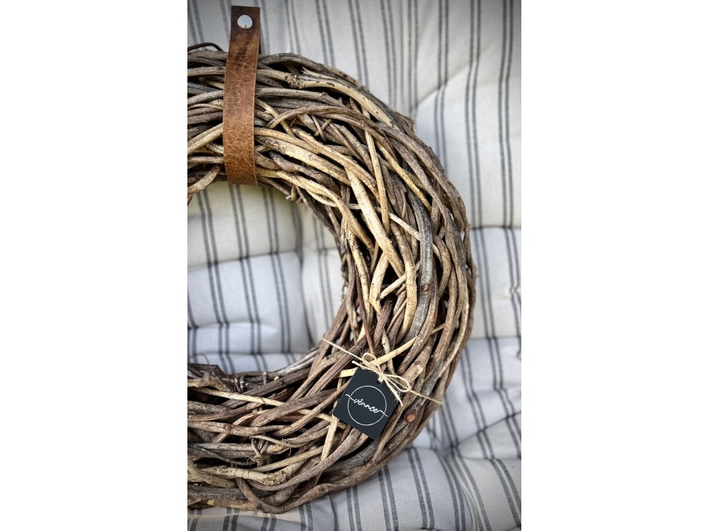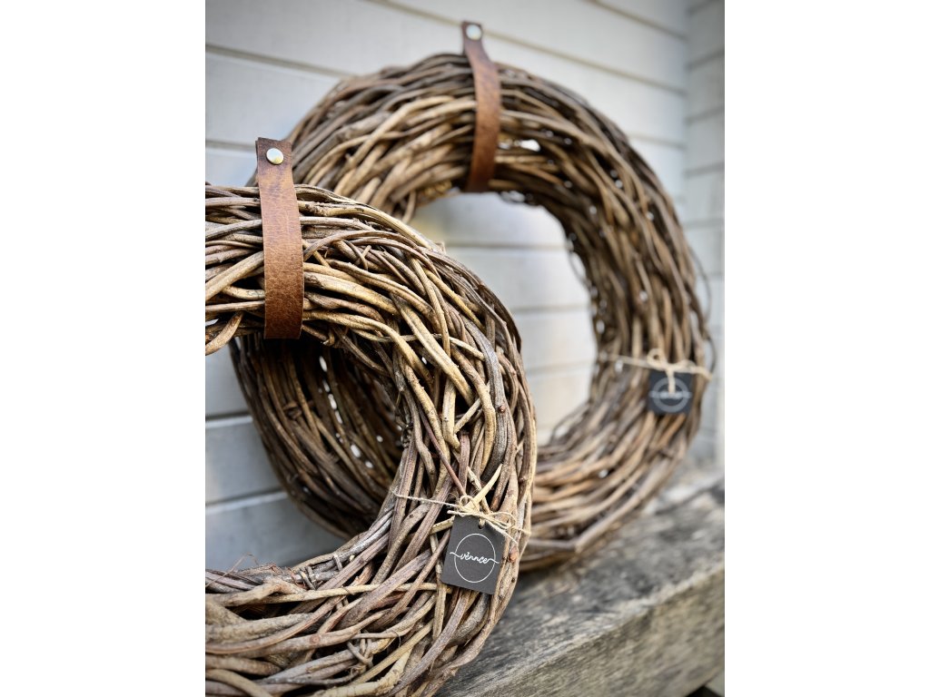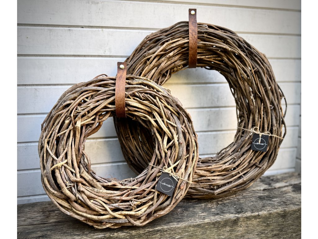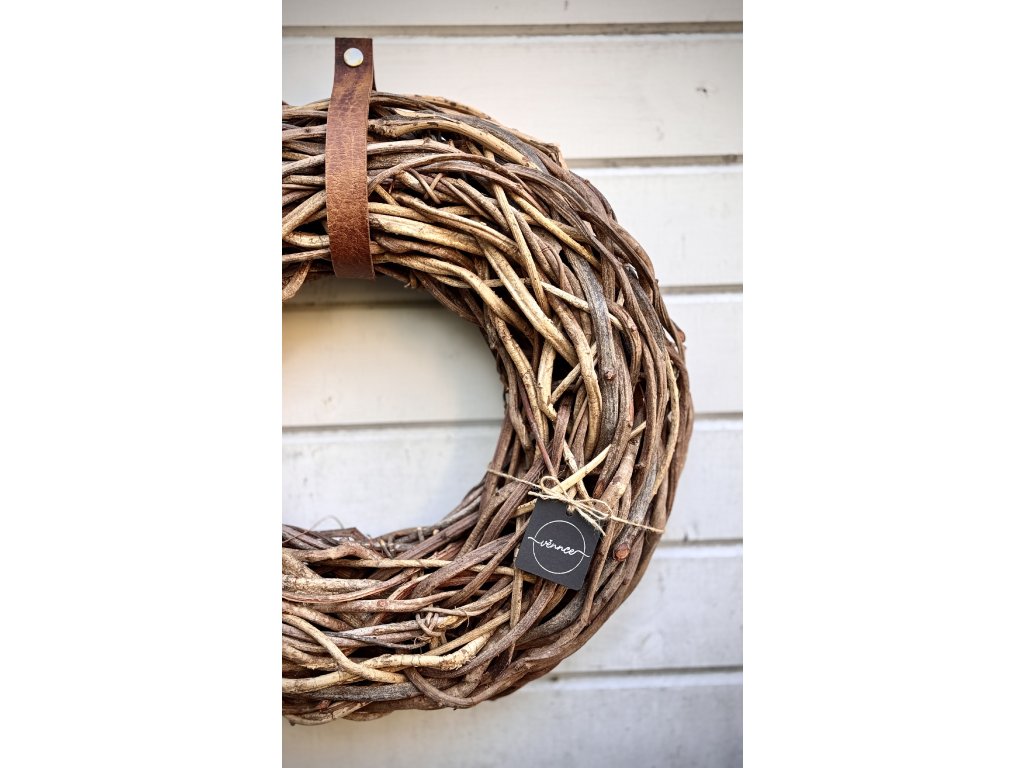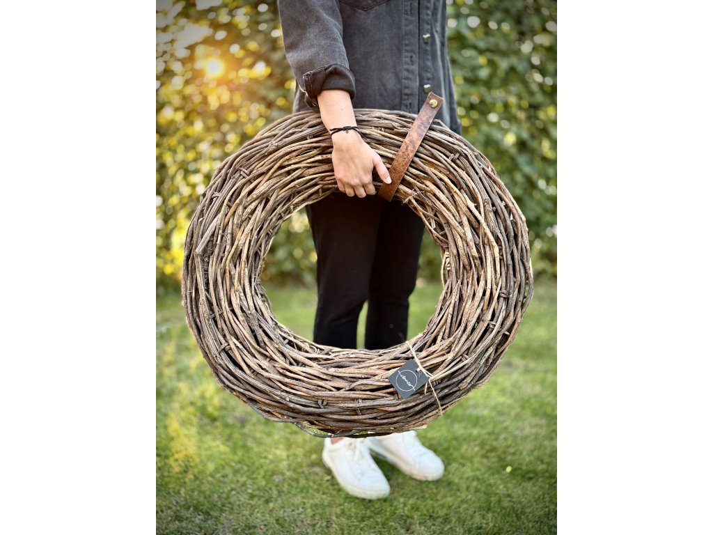Krásný proutěný věnec ze zaplétané révy. Tento věnec je užší a vzdušnější než Hnědý rustikální věnec v naší nabídce. Vhodný jako celoroční dekorace do interiéru i exteriéru. Věnec je ozdoben vintage koženým páskem. Každý věnec je originál, může se mírně lišit.