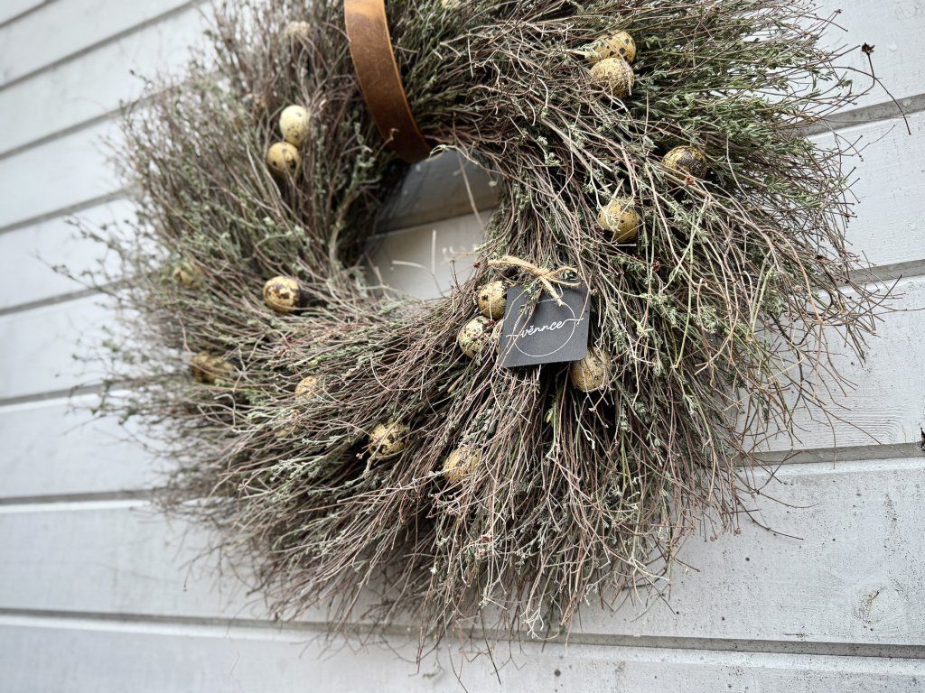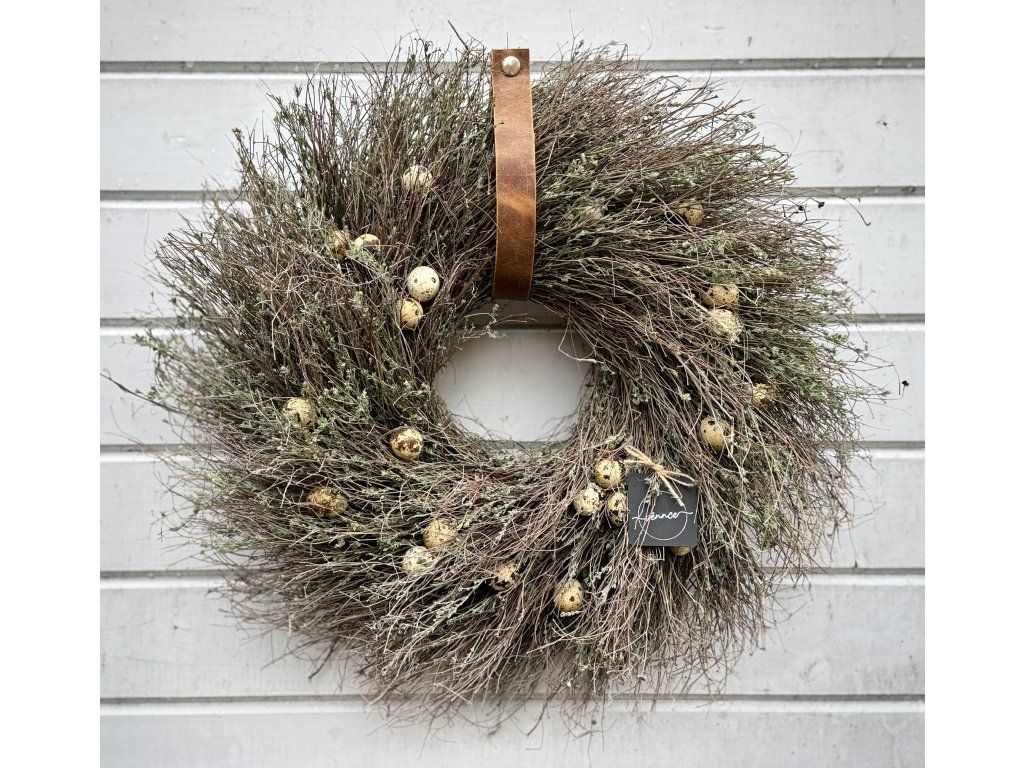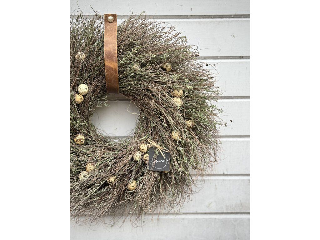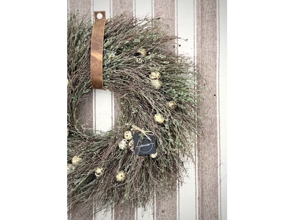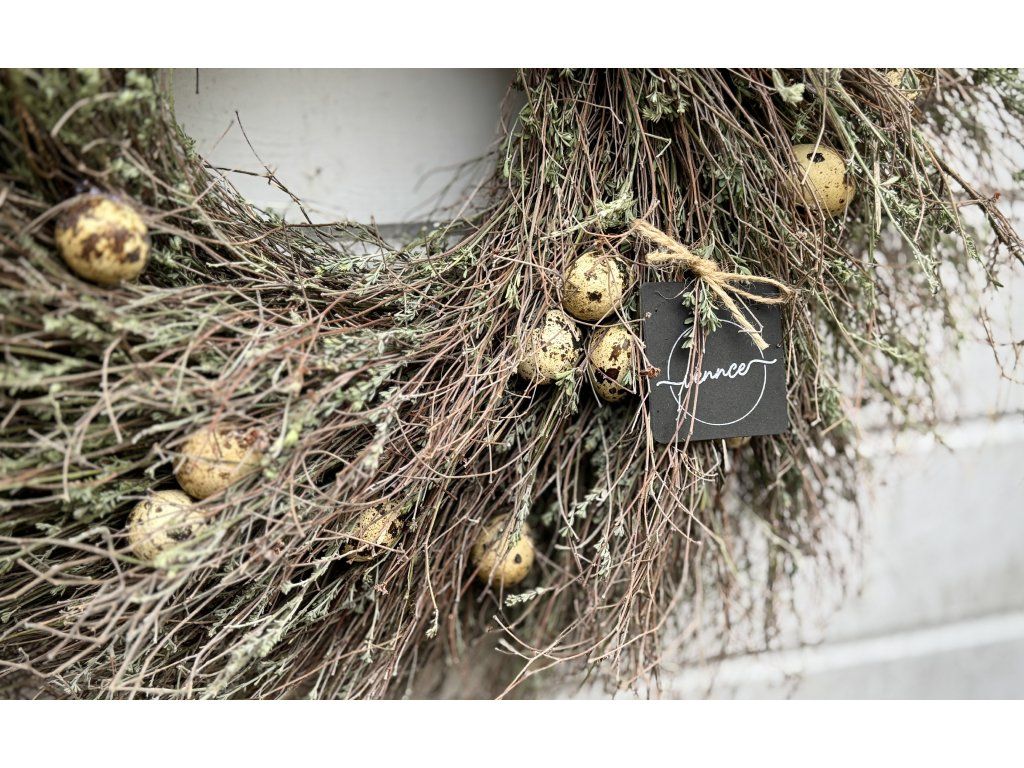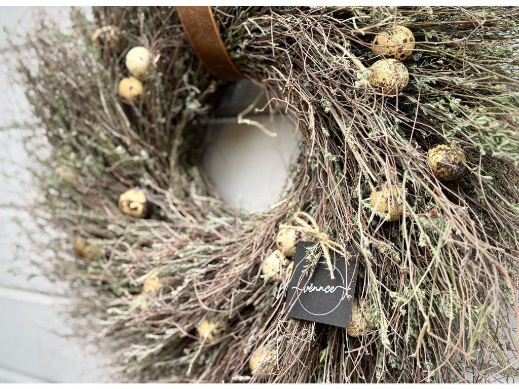 Věnec z divokého tymiánu dozdobený pravými křepelčími vajíčky. Průměr cca 50 cm, s přesahy až 55 cm. Věnec je ideální pro velikonoční výzdobu, snadno ho zkombinujete s dalšími jarními dekoracemi. Pokud by se některé z vajíček během přepravy jemně poškodilo, ponechte jej klidně přiznané – působí pak jako přirozeně rozklepnuté a dodává věnci ještě autentičtější charakter. Ihned k odeslání.