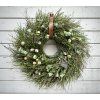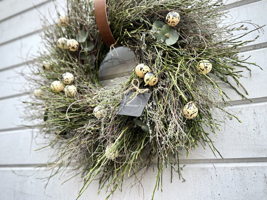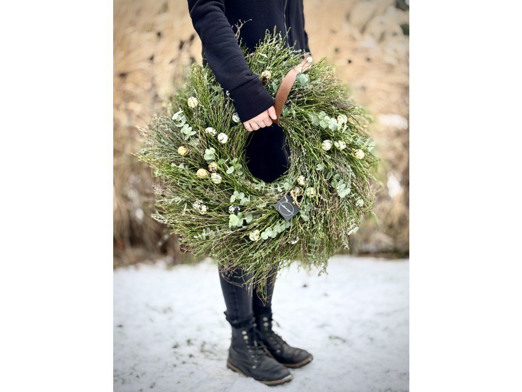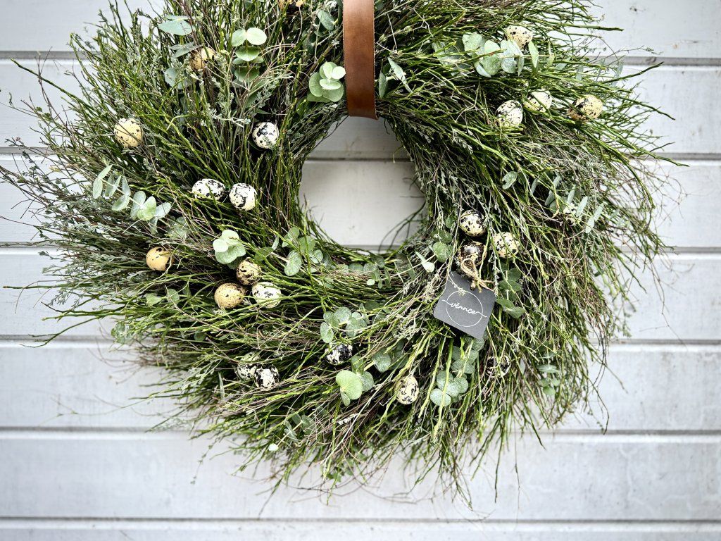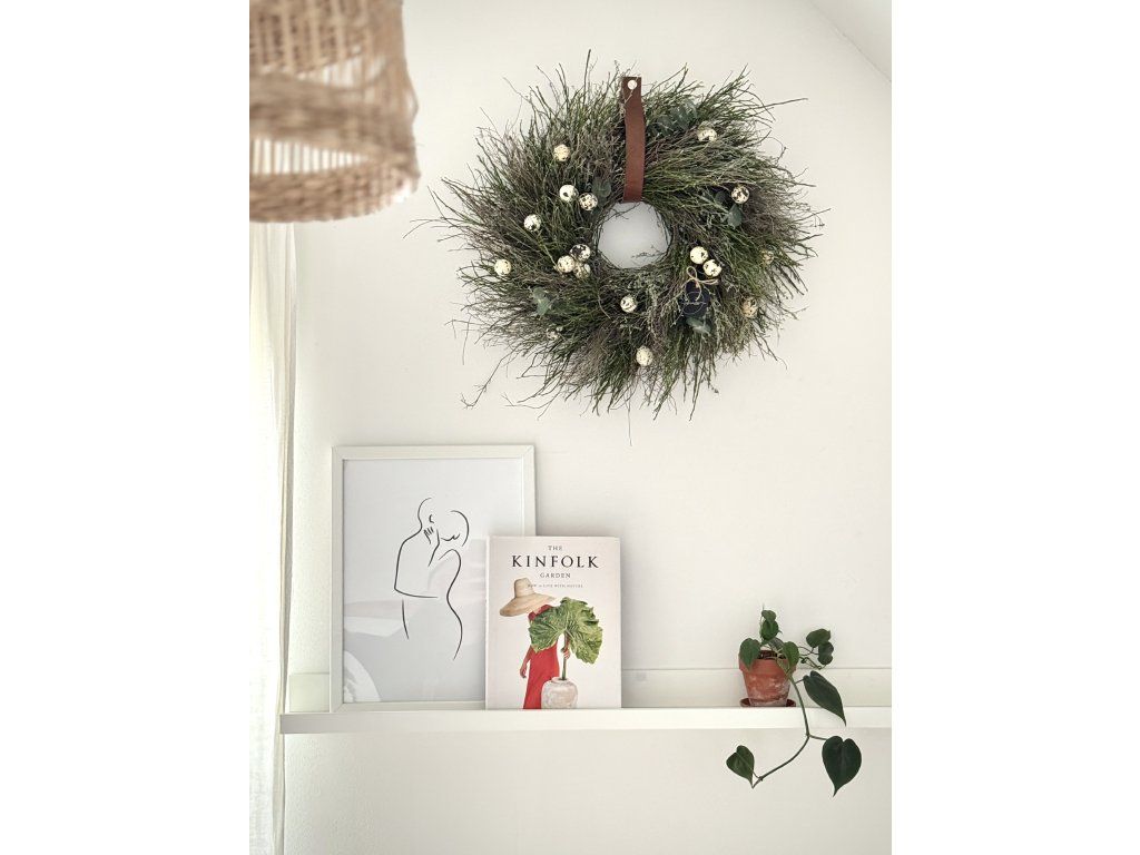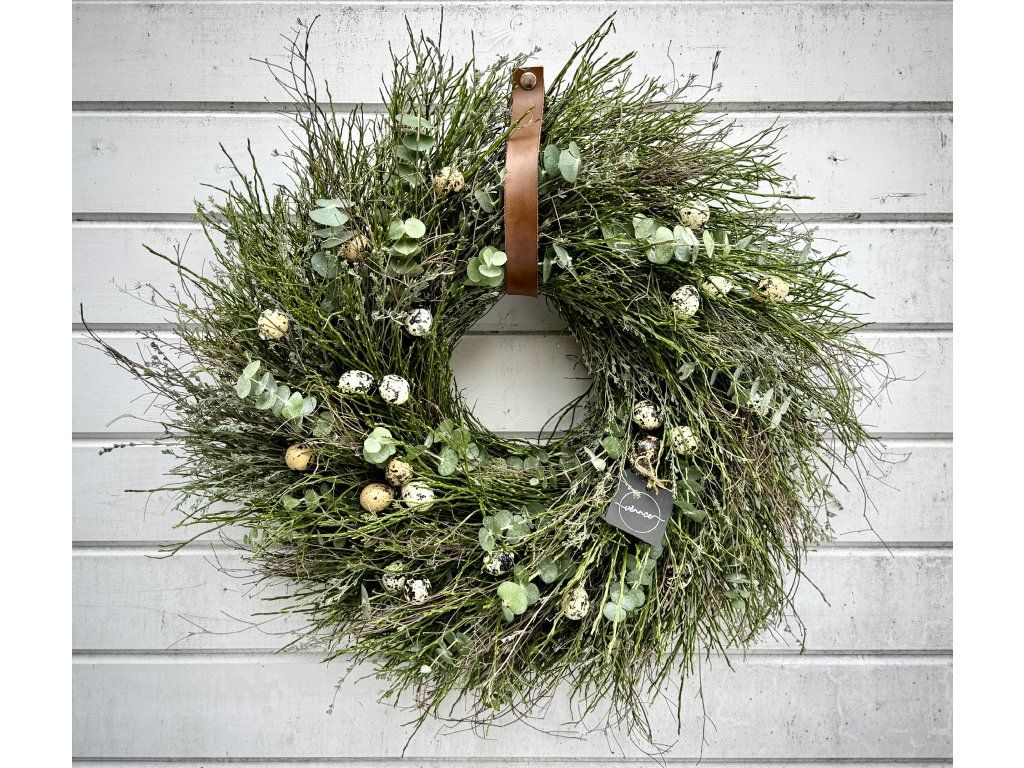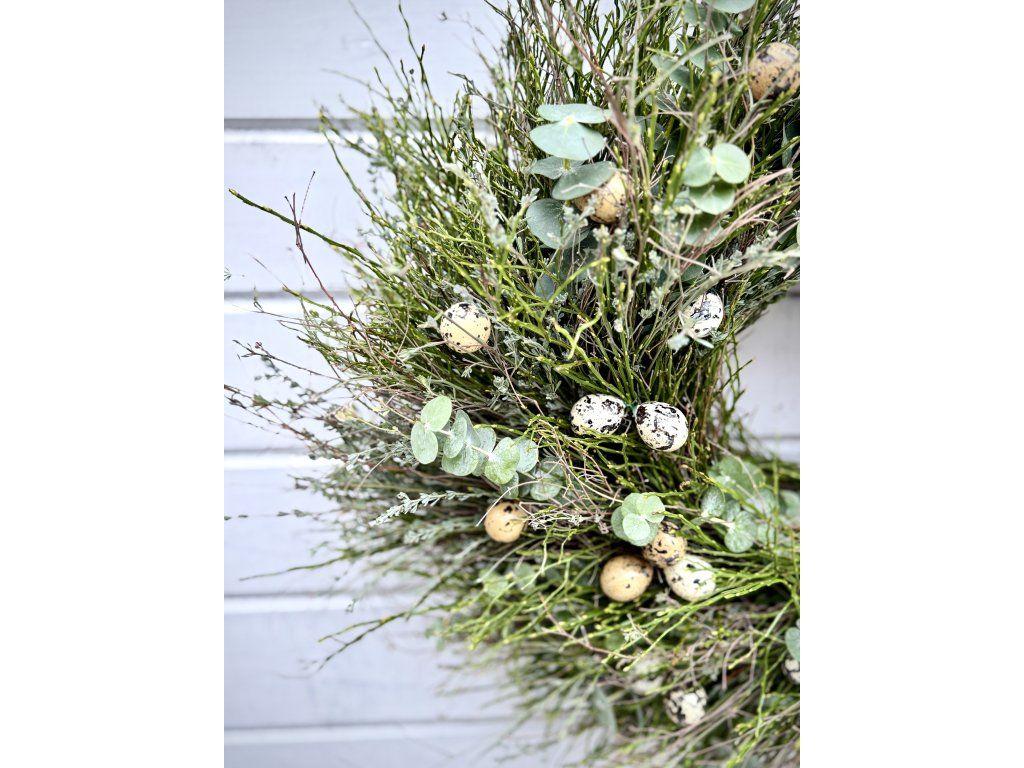 Jarní věnec uvázaný z borůvčí, divokého tymiánu a eukalyptu. Věnec v přirozeném, lehce rozcuchaném stylu je doplněn umělými křepelčími vajíčky, která jsou k nerozeznání od pravých, ale na rozdíl od nich bezpečně přežijí přepravu. Vajíčka jsou upevněna drátkem, je možné je sundat a dekoraci přizpůsobit podle sezóny. Hodí se jako jarní a velikonoční dekorace na dveře či stěnu.. Dodací lhůta je aktuálně 2-3 týdny od zaplacení. Každý kus je originál.