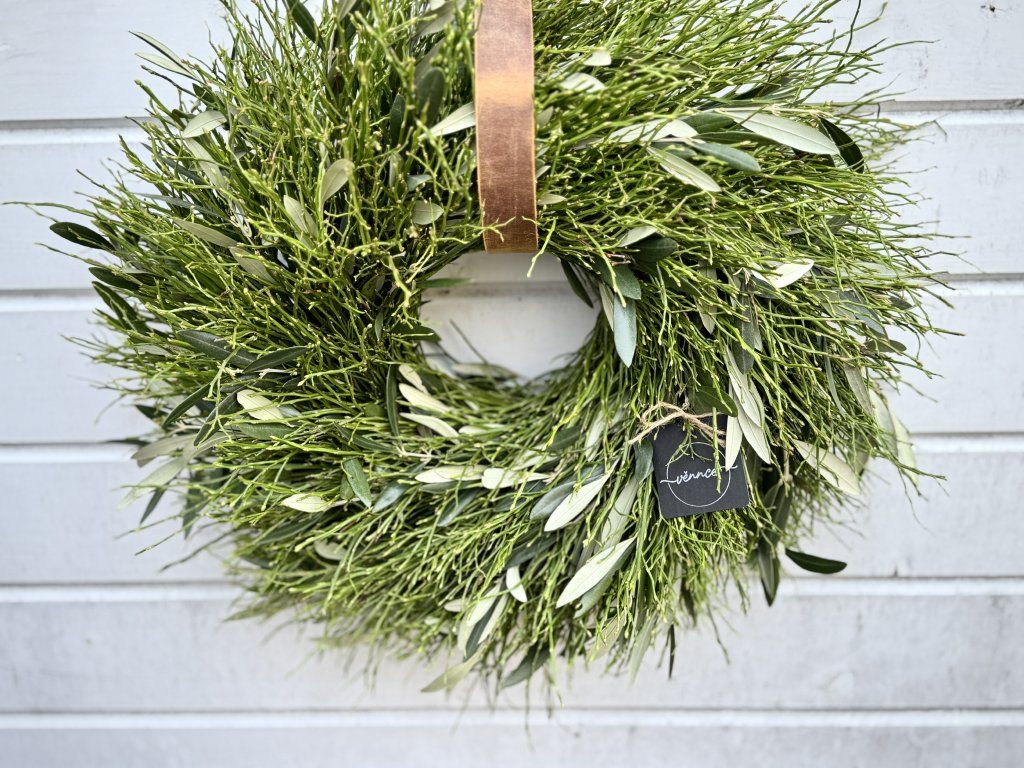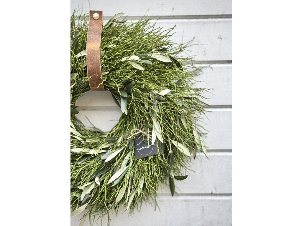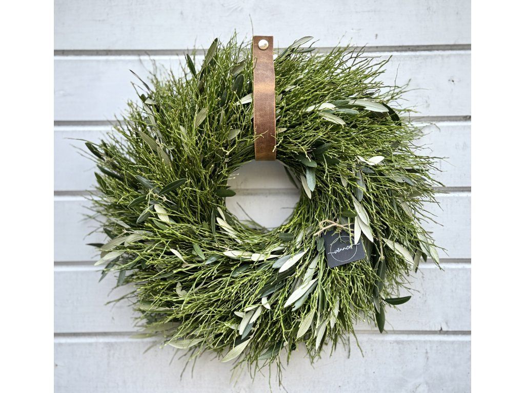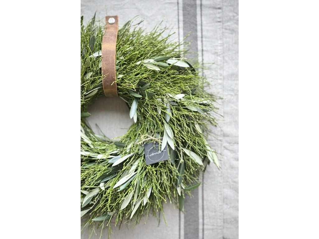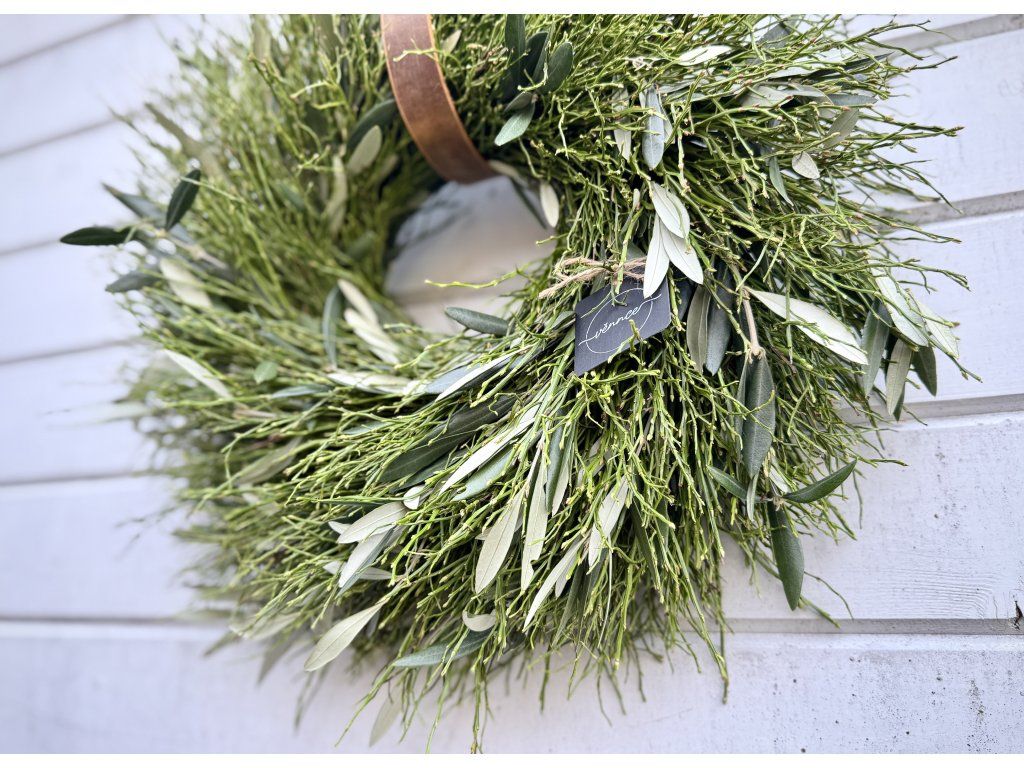 Svěží jarní věnec v přirozených tónech zelené je vytvořen z jemného borůvčí a větviček olivovníku, které spolu tvoří harmonickou a nadčasovou kombinaci.
